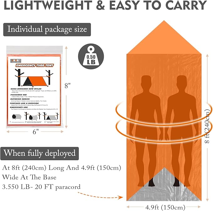 Awaryjny namiot survivalowy typu „tube tent” wykonany z folii Mylar (PET metalizowany) — odbija ciepło i chroni przed deszczem oraz wiatrem. Zmieści się w dłoni, a w sytuacji kryzysowej daje natychmiastowe schronienie dla 1–2 osób.