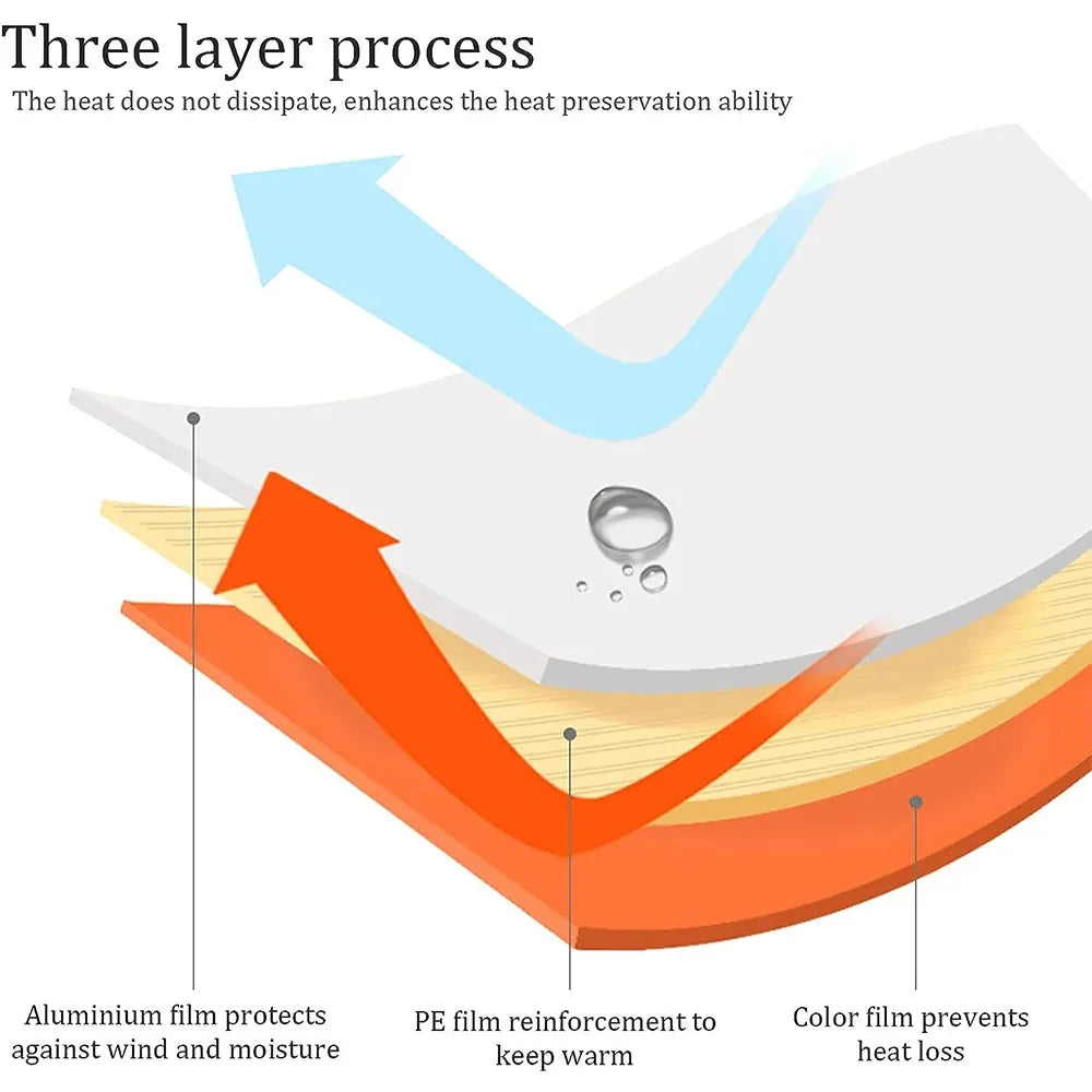 Zaprojektowany z materiału termicznego, odbija i zatrzymuje do 90% ciepła ciała, pomagając zapobiec hipotermii i szokowi termicznemu.